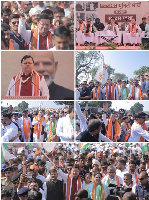 मुख्यमंत्री ने कहा सरदार@150 यूनिटी मार्च के अंतर्गत उत्तराखंड सरकार ने देवभूमि उत्तराखंड के प्रत्येक जनपद में भी एकता यात्रा का आयोजन किया। मुख्यमंत्री ने बताया उन्होंने स्वयं चार प्रमुख स्थानों पर एकता यात्रा में प्रतिभाग किया है। एकता यात्रा के माध्यम से युवाओं को नशा मुक्ति, योग और स्वास्थ्य जैसे विषयों से जोड़ने के साथ सहकारिता मेलों का आयोजन कर स्थानीय हस्तशिल्प और स्वदेशी उत्पादों के प्रचार प्रसार की दिशा में भी कार्य किया गया है।