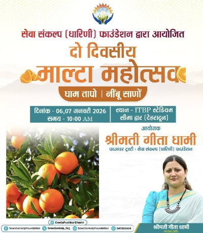 देहरादून। सेवा संकल्प (धारिणी) फाउंडेशन द्वारा दो दिवसीय माल्टा महोत्सव का आयोजन ITBP स्टेडियम, सीमा द्वार (देहरादून) में 06 – 07 जनवरी को किया जा रहा है। महोत्सव का शुभारंभ सुबह 10 बजे होगा। फाउंडर ट्रस्टी सेवा संकल्प (धारिणी) फाउंडेशन गीता धामी ने बताया कि दो दिवसीय माल्टा महोत्सव केवल एक आयोजन नहीं, बल्कि उत्तराखंड के पर्वतीय किसानों विशेषकर माल्टा उत्पादक किसान भाइयों-बहनों की मेहनत, आत्मनिर्भरता और संभावनाओं को मंच देने का प्रयास है।