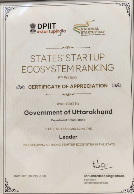 देहरादून। मुख्यमंत्री पुष्कर सिंह धामी के नेतृत्व में राज्य का देश में लगातार ‘मान’ बढ़ रहा है… भारत सरकार के वाणिज्य एवं उद्योग मंत्रालय के अंतर्गत उद्योग संवर्धन एवं आंतरिक व्यापार विभाग (DPIIT) द्वारा जारी States’ Startup Ecosystem Ranking (5वां संस्करण) में उत्तराखण्ड को मजबूत स्टार्टअप इकोसिस्टम विकसित करने में ‘लीडर’ के रूप में मान्यता प्रदान की गई है। इस उपलब्धि के लिए राष्ट्रीय स्टार्टअप दिवस के अवसर पर उत्तराखण्ड सरकार के उद्योग विभाग को Certificate of Appreciation प्रदान किया गया।