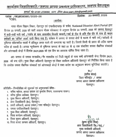Dehradun Big News : बारिश को देखते हुए देहरादून जिले में 24 जनवरी को स्कूलों में अवकाश घोषित … कक्षा 1 से कक्षा 12 तक के स्कूलों में अवकाश रहेगा By Kranti Mission - January 23, 2026 0 55 Share on Facebook Tweet on Twitter tweet क्रांति मिशन ब्यूरो देहरादून। भारी बरसात के चलते 24 जनवरी को जिले में कक्षा 1 से कक्षा 12 तक के स्कूलों में अवकाश रहेगा। इसके आदेश जारी हुए हैं। स्कूल प्रबंधन को अवकाश करने के आदेश हुए हैं।