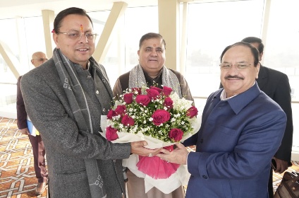 देहरादून। मुख्यमंत्री पुष्कर सिंह धामी ने उत्तराखंड पहुंचने पर केंद्रीय स्वास्थ्य एवं परिवार कल्याण और रसायन व उर्वरक मंत्री जगत प्रकाश नड्डा का स्वागत किया। मुख्यमंत्री धामी के साथ भाजपा प्रदेश अध्यक्ष व राज्य सभा सांसद महेन्द्र भट्ट भी मौजूद थे।