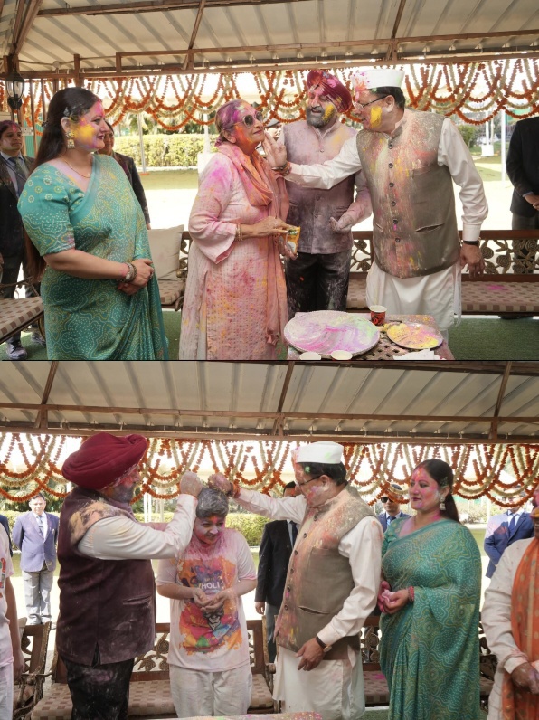 देहरादून। लोकभवन में आयोजित होली मिलन समारोह में राज्यपाल लेफ्टिनेंट जनरल गुरमीत सिंह (सेवानिवृत्त) एवं गुरमीत कौर ने मुख्यमंत्री पुष्कर सिंह धामी समेत सभी अतिथियों का अभिनंदन किया। रंगोत्सव में खूब गुलाल उड़ा।