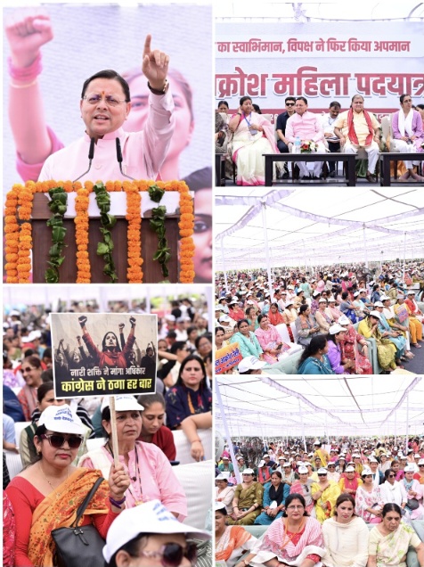 संबोधन के पश्चात मुख्यमंत्री पुष्कर सिंह धामी के नेतृत्व में पदयात्रा भी निकाली गई, जिसमें हजारों की संख्या में महिलाओं ने उत्साहपूर्वक भागीदारी की। इस दौरान नारी शक्ति वंदन अधिनियम के विरोध को लेकर कांग्रेस के खिलाफ जोरदार आक्रोश देखने को मिला और महिलाओं ने एक स्वर में कांग्रेस और उसके सहयोगी दलों की नीतियों का विरोध करते हुए नारी सम्मान के समर्थन में सशक्त संदेश दिया।